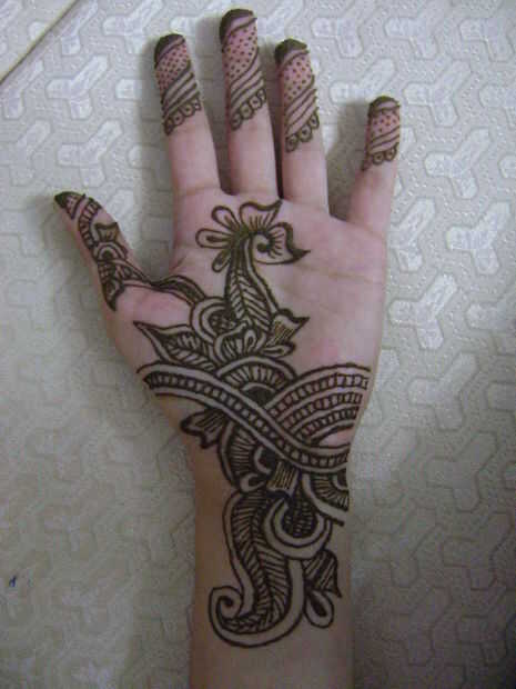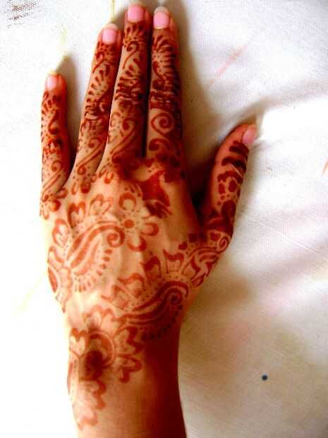 Henna da diferentes colores en diferentes pieles. En las palmas, el color es más oscuro, cerca de negro a veces. En el otro lado de la mano, el color es mucho más ligero y luego en el brazo consigue más ligero. El color viene mejor después de uno o dos días. Usted notará la diferencia de la vida cotidiana de color, primero va más oscuro, entonces después de pocos días, es más ligero y por último su desaparecido!