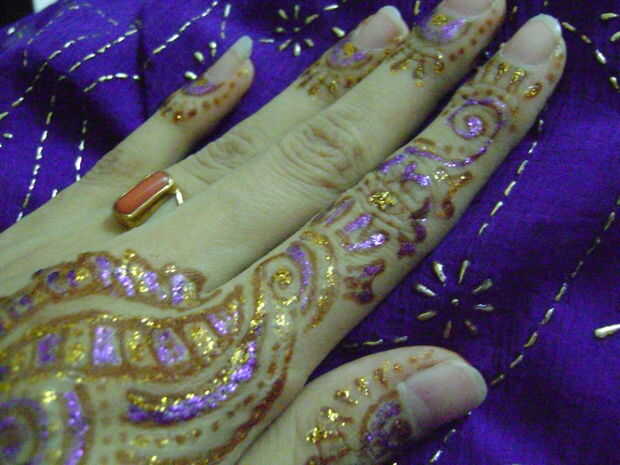 También puede decorar henna con brillo. Conos de brillo están disponibles en diferentes colores. Cuando usted va en alguna parte, aplique brillo una hora antes y deje que se seque completamente ya que toma más tiempo para secar. Mantenga las manos alejadas del agua ya que es soluble en agua para no arruinar tu trabajo!