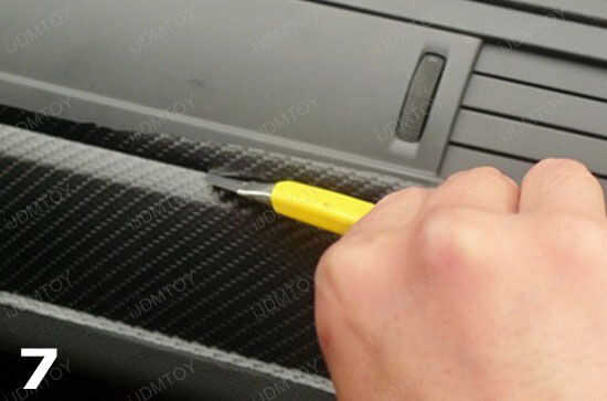 Mientras ponía en la hoja de vinilo fibra de carbono en el interior de su coche, asegúrese de pulsar en la hoja de vinilo por lo menos 1 pulgada detrás de la zona de su aplicación. Al hacerlo, puede asegurarse de que el adhesivo de la hoja de fibra se adhiere bien con el área. Si la hoja de la fibra no se encuentra correctamente, la hoja podría salir durante un cierto lapso de tiempo.