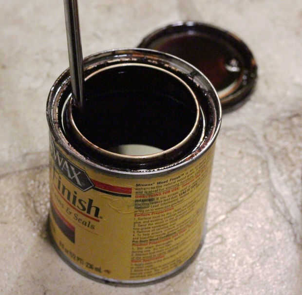 Aplique colorante a la trapo (inmersión de trapo en el envase, como se muestra). Conseguir una cantidad controlable de mancha en el trapo (trapo debe estar húmedas pero no chorreando. Volver a mojar el trapo con la mancha, según sea necesario.)