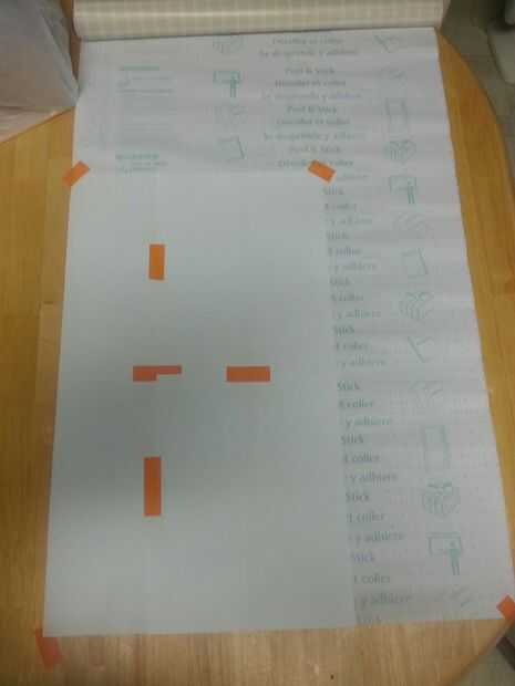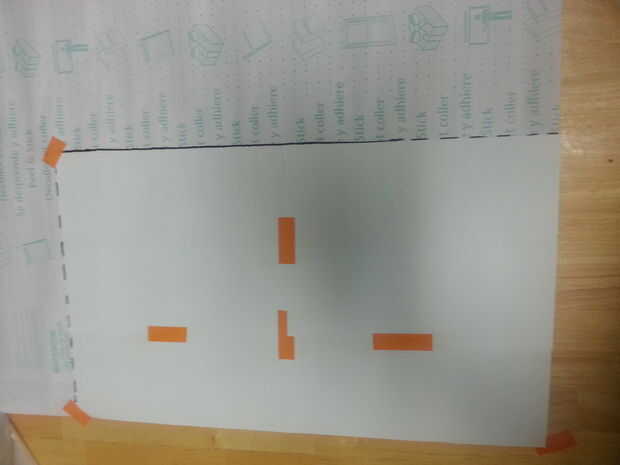 Tire hasta la plantilla de papel y colóquelo en la parte trasera del rodado hacia fuera papel contacto. Tratar de conseguir el papel de contacto tan plano como lo puede conseguir. Mina había pegada a la mesa. Luego asegure la plantilla en el borde de papel de contacto asegurándose de que alinee la esquina.