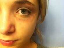 Utilizar el mismo cepillo pequeño sombra de ojos para una suave sombra de ojos púrpura de punto ligeramente a lo largo de la misma área que hizo la barra de labios y en el pliegue del ojo. Esto da color a la parte más ligera de la contusión.