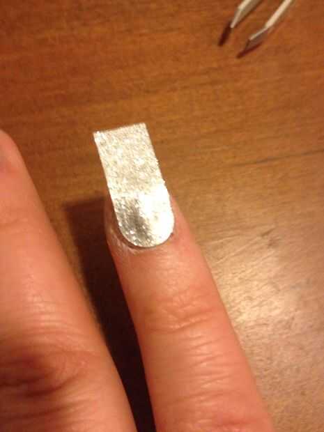 Con el palito de naranja, cáscara de nuevo el abrigo de un corte es la mitad con las tijeras de la cutícula. Entonces, ya sea con el palo de naranja o unas pinzas, sujetar la envoltura en de su fuente de calor durante 3-5 segundos. Por último, aplica la envoltura a la uña.
