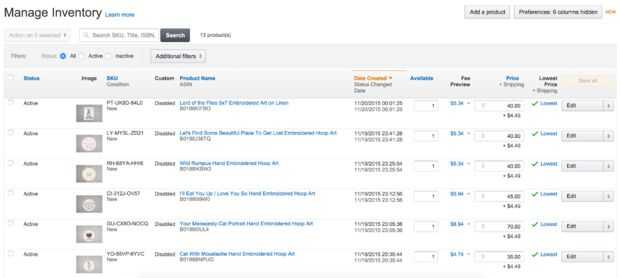 Me gusta mucho el sistema de inventario de Amazon. Tiene fácil acceso a tanta información de un vistazo, y eres capaz de editar, eliminar y copiar listados.