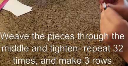 Tomar las piezas que dobla en el ultimo paso. Poner cada pieza por la mitad de la otra. Repita el paso 32 (o más) veces, luego pasar a la siguiente tira. Asegúrese de que cada tira tiene la misma cantidad de tiras.