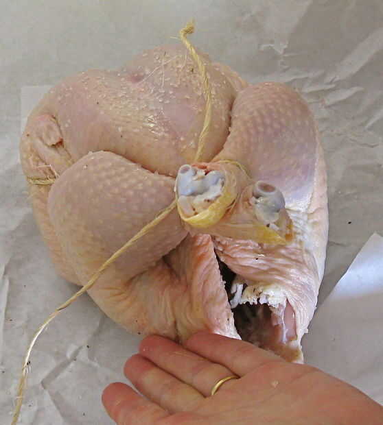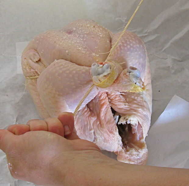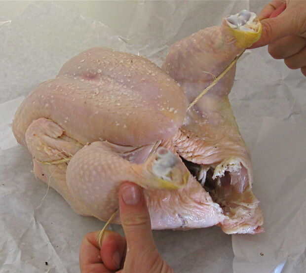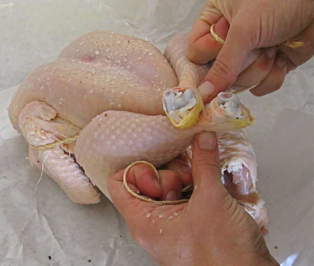 Separar las cuerdas, lazo alrededor de los tobillos de pollo, luego hacer un nudo cuadrado para acabar. Las piernas ahora deben ser ceñidas en cerca del cuerpo.