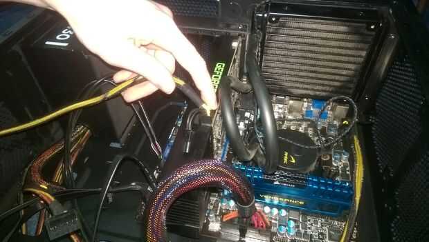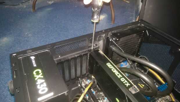Destornille los dos tornillos en la ranura PCI-E y coloque su tarjeta gráfica en la ranura PCI-E hasta que quede. Atornille los dos tornillos en el, sosteniendo la GPU en su lugar. Conecte su GPU a un cable de PCI-E de la fuente de alimentación para dar la potencia de la GPU.