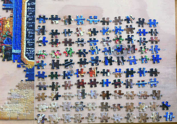 me gusta armar rompecabezas y colgantes para decoración del hogar.  Usted tiene algunas opciones cuando se trata de mostrar un rompecabezas terminado.  La forma más barata es solo pegarlo en un marco que sostiene apretado, pero no pegados juntos.  Co