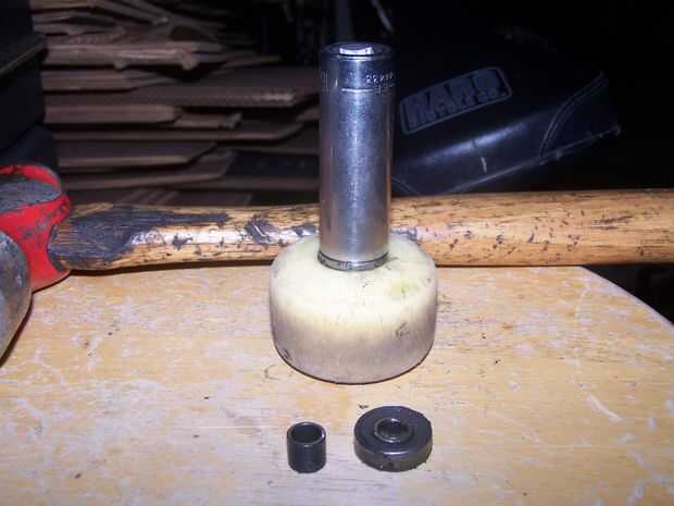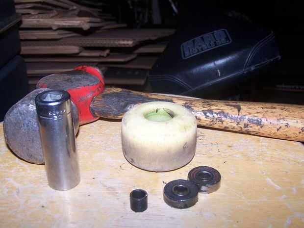 Tomar rodamiento y empuje hacia la rueda lo más lejos posible con la mano y luego tomar el zócalo más grande tienes y colocar así el anillo de él para su en el aro exterior del rodamiento. Tome el martillo y martillo la toma hasta que el cojinete está en. Una vez que tenga insertar al espaciador del cojinete. Luego lo repites en el otro lado y las ruedas. Recuerde cuando suave poniendo en los rodamientos son lo que hace que la placa del rodillo.