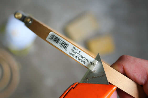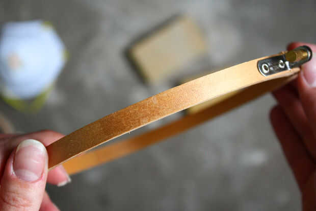 La mayoría de las etiquetas que me he encontrado en aros de madera bordado son una pesadilla, así que me gusta raspar la etiqueta apagado utilizando un cuchillo afilado. Aquí estoy usando un cortador de caja!