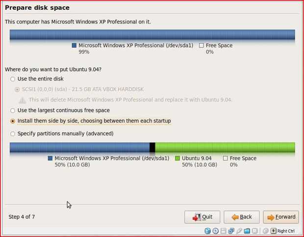 3. el instalador cargará al particionador. Si has seguido la versión 8.04, esto se verá un poco diferente. La opción de cambiar el tamaño no es el predeterminado, y no parece estar allí en absoluto! En su lugar elige "instalarlos side by side", como se puede ver a continuación. Aceptar y seguir adelante. Esto puede tardar un poco dependiendo del tamaño de disco duro.