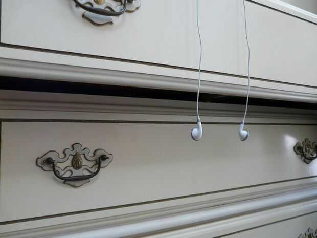 Los audífonos se extienden sobre el borde de una mesa o un cajón abierto y un clip o el otro extremo de los cables para asegurarse de que no caen de peso.