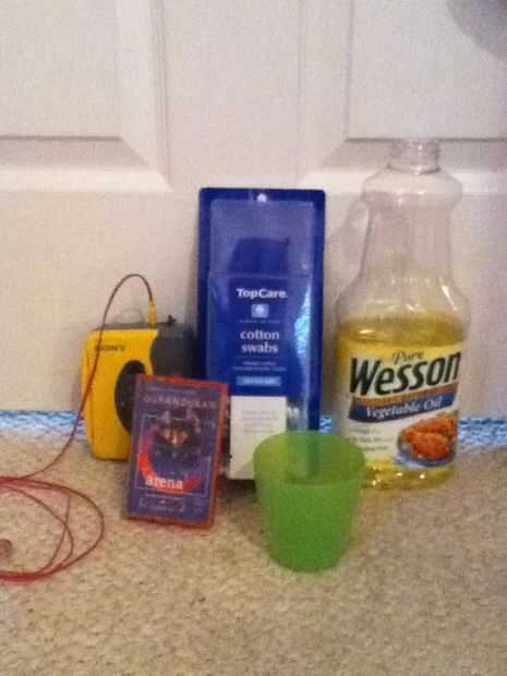 & bull; Un chillido cassette & Bull; Un reproductor de cassette portátil (especialmente uno que se abre mientras que usted está jugando la cinta) & Bull; Aceite vegetal & Bull; Q-tips & Bull; Un paño limpio & Bull; Una taza (opcional)