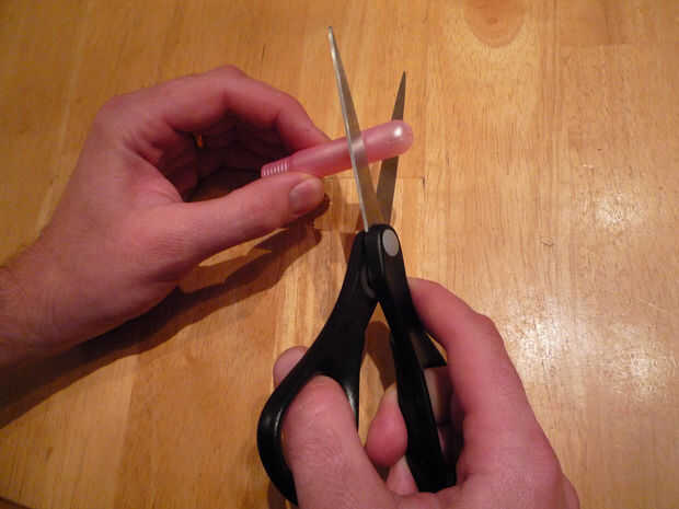Porque no podíamos reutilizar la tapa de plástico blanco, cortamos, queríamos algo rugoso para evitar que esto vuelva a suceder. Introduzca el tapón. Corte el extremo redondeado.