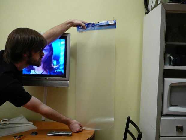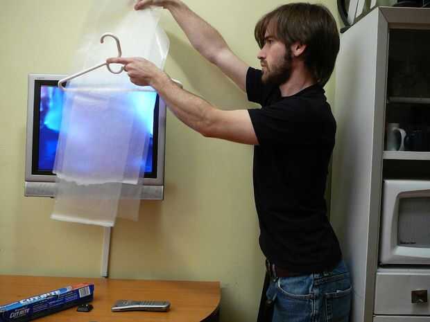 • Cortar tres o cuatro hojas de papel de cera que son dos veces más, siempre y cuando la TV es alta. Cuelgue la percha como un par de pantalones, igualmente colgando a cada lado de las hojas.