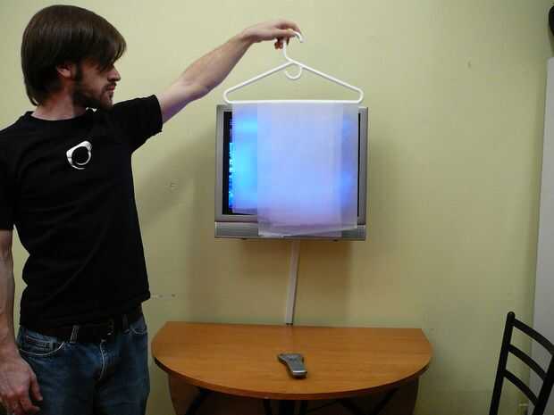• Frente a la TV dentro alcance del. Mantenga la percha hasta unos 10 cm de la pantalla y mirar a través del papel de cera en la TV. La imagen de TV a través del papel debería verse como manchas borrosas, coloreados.