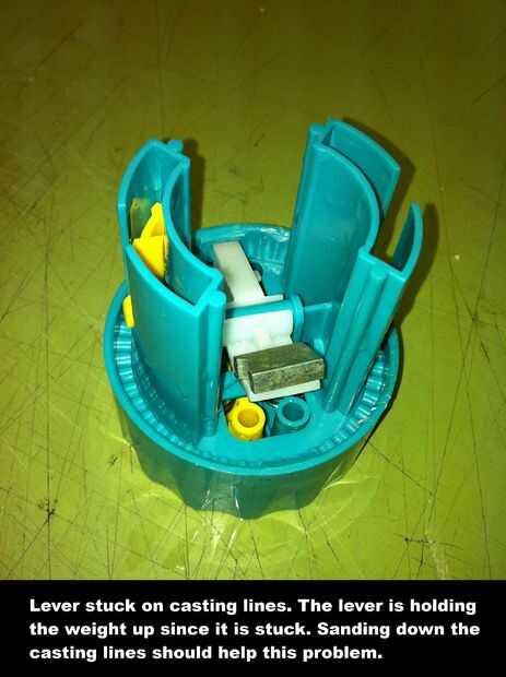 Parece que el eje de la palanca pivota alrededor tiene fundición de líneas en ambos lados, causado por el proceso de fabricación. Parece que la palanca puede a veces obtener 'pegada' en estas manteniendo la válvula en la posición hacia arriba. Por esta razón zangoloteo el flush botones a veces obras para desalojar el montaje de la válvula.