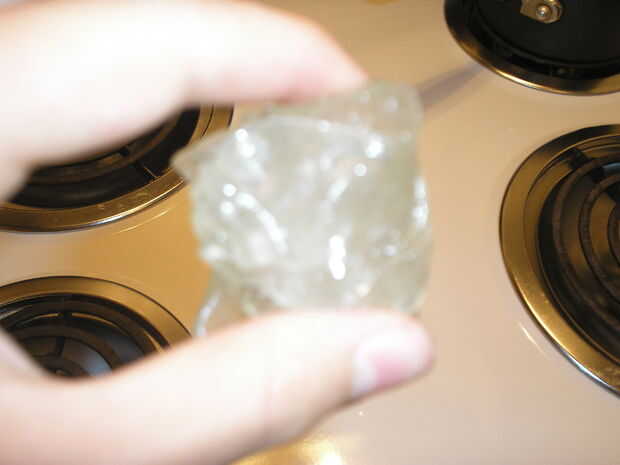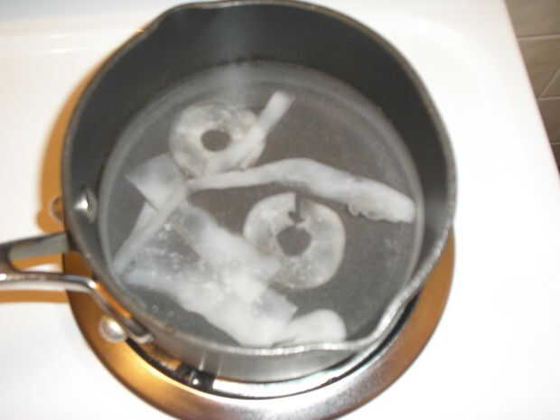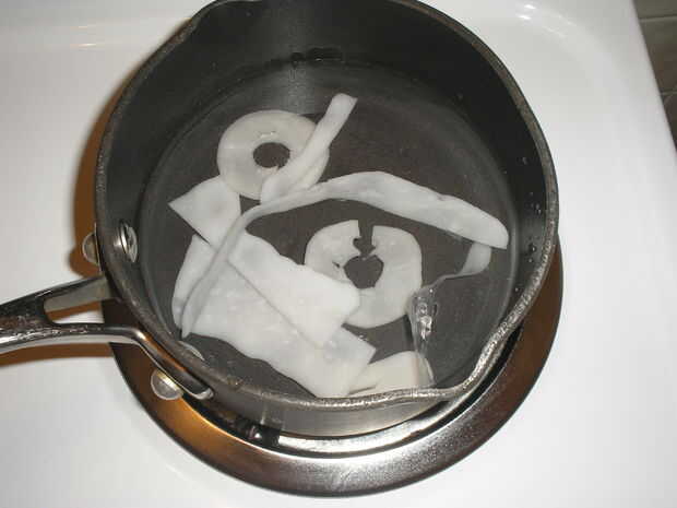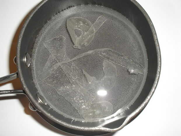 Fill your pot with about 3/4 inches of water. Coloque la olla sobre el quemador y ajustar la estufa a fuego medio. Estimar cuánto instamorph usted necesita y colóquelo en la olla. Puede agregar más tarde si es necesario. Utilicé restos de proyectos anteriores, pero puede utilizar las pastillas si lo desea. Una vez que el instamorph empiece a claro, usted puede bajar la temperatura un poco. Cuando está totalmente claro, sacar con sus pinzas o algo similar a eso. Asegúrese de que la mayoría del agua está apagado porque una vez que usted lo saca de la agua caliente, el instamorph no será caliente, pero será alguna gota de agua. Rodillo de la instamorph en una bola por lo que es más manejable.