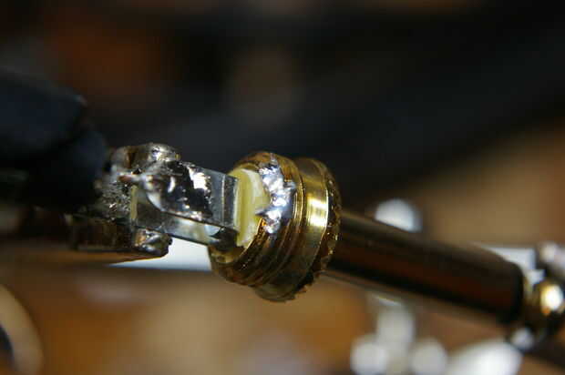 El empalme mecánico puede causar la señal de forma intermitente para recortar. Por eso a veces se vuelva a soldar todo y el cable todavía le dará problemas. Usted podría encontrar que algunos enchufes permiten girar la punta y ver el pequeño remache interior convirtiendo así. Si resulta, no es apretado. Si no está apretado... silencio posible.