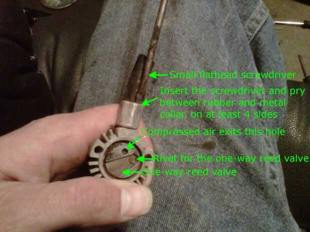 Mi compresor de CH, se rompió la válvula unidireccional de la caña. Corté un similar tamaño y forma de una lata de soda (soda Super Chill limón [Albertsons]). Taladrar el remache con la ficha, corrió un pequeño grifo (un grifo hace hilos) por el agujero y atornillar un pequeño tornillo para sujetar la pestaña hacia abajo. Tenía la cabeza del tornillo plana de la máquina para que el pistón no interfiriera con él.