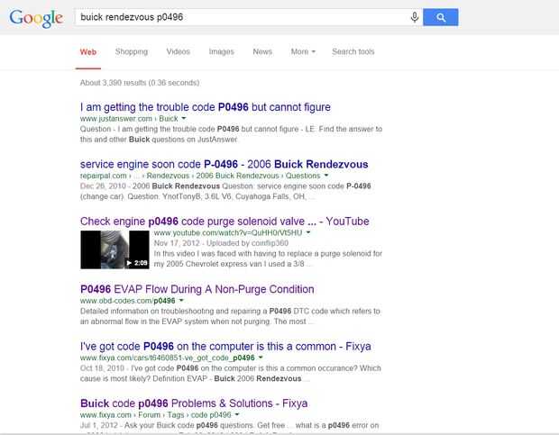 Buscar el código junto con su vehículo. Así que aquí está lo que escribí en la barra de búsqueda. "Buick rendezvous P0496 OBD". También puede añadir el año de su vehículo pero tenga esto en cuenta. Modelos de vehículos cambian año a año pero lo que está bajo el capó el mismo puede permanecer por años. Si su vehículo es 2008 y y el post es para el modelo pero de 2005 la solución podría ser la misma. He encontrado un post en el que dijo que podría ser la válvula de purga con sede fuera de mis síntomas y código.