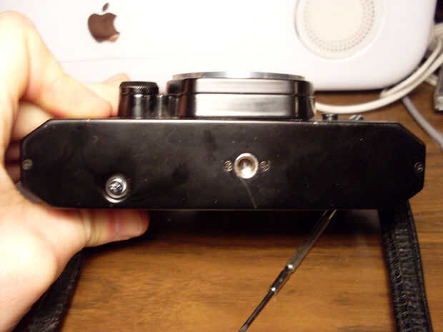 Con el destornillador Phillips, retire los cuatro tornillos que mantienen la placa base en su lugar. Si el cuerpo nunca ha sido abierto, será necesario alguna medida de fuerza en orden para quitar los tornillos. Tenga en cuenta el cero debajo de la conexión de trípode. Es algo del destornillador deslizarse cuando trató de retirar el segundo tornillo. Así que sí, usted nunca algunos obligará a la primera vez. Oh sí y no use aceite para ayudar a los tornillos a lo largo de!