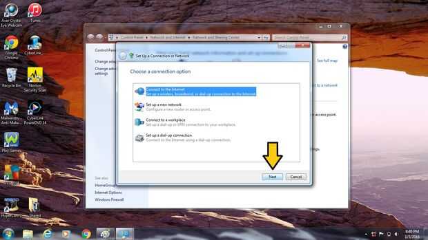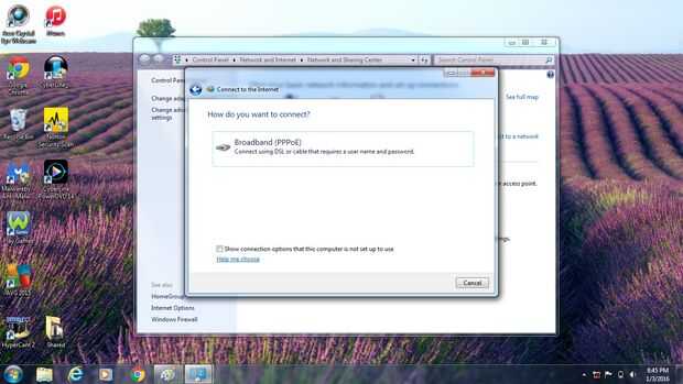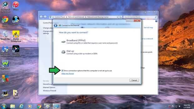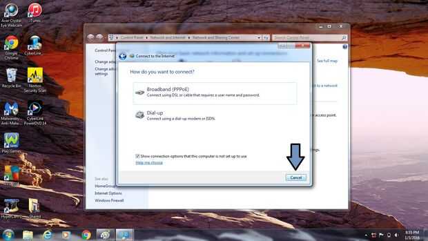 Si las únicas opciones que tienes son de banda ancha (conexión con cable) y Dial-up, haga clic en cancelar y cerrar la ventana
