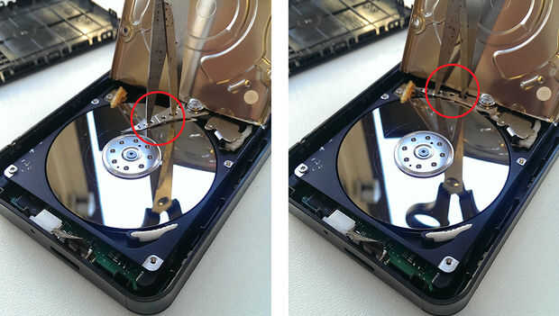 Verás varios agujeros a lo largo del brazo de la readhead. Con las tijeras, poner los dientes de la final en dos de los agujeros (su elección) y mueva con cuidado la parte posterior de la cabeza lectora de la superficie y en él ha estacionado posición.