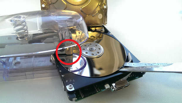 Retire provisionalmente el destornillador, teniendo cuidado de mantener las tijeras en su lugar. Ahora, suavemente Deslice la parte inferior de la grapadora en el propio cuerpo de la unidad y coloque el cabezal del engrapado en el centro de la cara del plato.