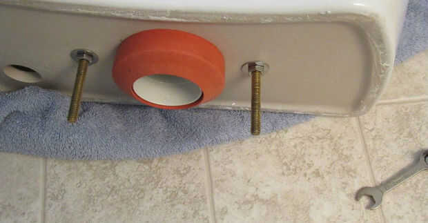Instalar nuevo hardware y nueva Junta de goma para tanque de inodoro. Por dentro de la arandela de goma tanque hilo a través del perno, que seguro en el exterior con arandela de metal que seguro con los pernos con una llave ½.