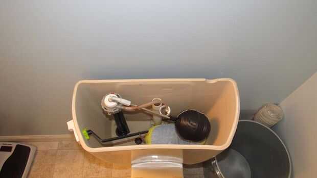 Retire la tapa del tanque del inodoro. Descarga inodoro y remojo de agua con esponja, drenan en el cubo.