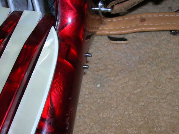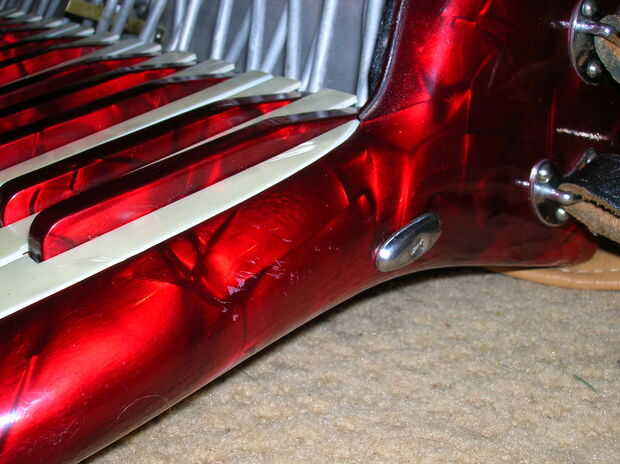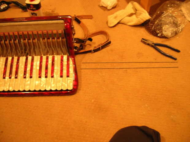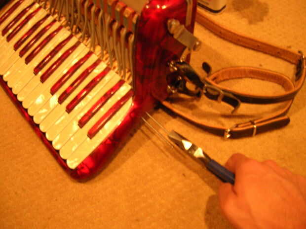 En la parte inferior borde del teclado (pasado el tono más alto, o hacia los pies cuando estás jugando) es una pequeña cosa metal con un tornillo en él. Aflojar ese tornillo a fing (uno o) dos protuberancias que son los inicios de los ejes de metal. Si el acordeón está en forma no demasiado buenas, podría ser un poco difícil sacar los husos. En mi caso, una vez que se acerca una o dos pulgadas, salieron bastante fácilmente. No doblar los ejes, trata de sacarlos hacia afuera.