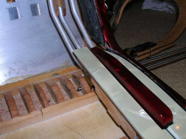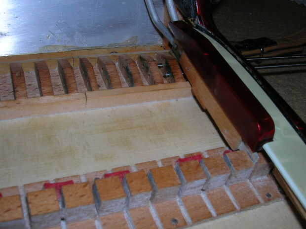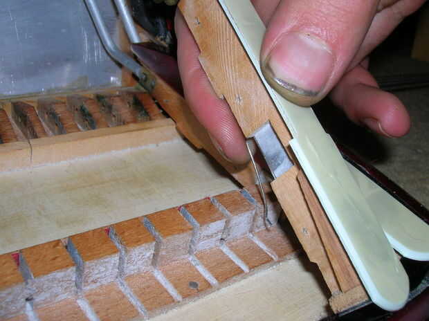 Luego poner los listones en los agujeros del listón y mover la parte superior de la espalda clave hacia las cañas para que las pestañas caigan en los espacios entre los listones del huso para que alineen los agujeros en las bridas con los husos. Esto es difícil y requiere paciencia y ensayo y error. Mira cómo las válvulas de línea para obtener ayuda.