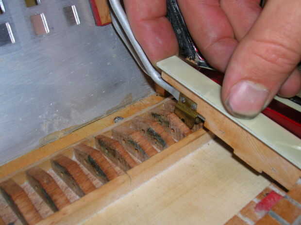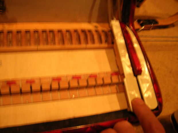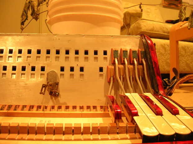 Comenzar poniendo los husos en los agujeros que vinieron hacia fuera (con los puntiagudos lado primero). Luego agarra la tecla más alta (o 2 llaves más alto, en mi caso) por lo que usted está sosteniendo la primavera junto a la tecla. Poner el resorte donde debe estar (en mi caso, en los agujeros del listón madera para llaves negro y justo antes de las pastillas rojo para las teclas negras).