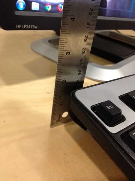 Tal vez el antiguo pie de teclado era demasiado pequeño... tal vez era demasiado grande, tal vez fue justo... De cualquier modo era, levante la parte posterior del teclado a una altura adecuada y luego medir esta distancia. A continuación, mida la distancia que tendrá su nueva pieza en el borde inferior. Esto crea para mí un triángulo con una altura de 1" y una longitud de 4"