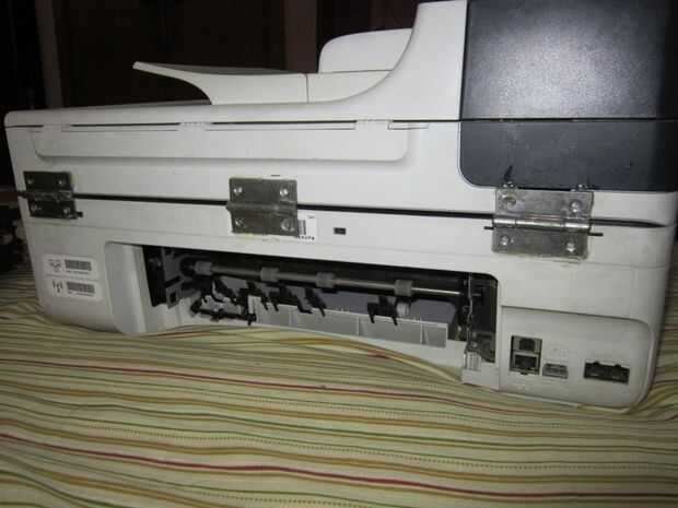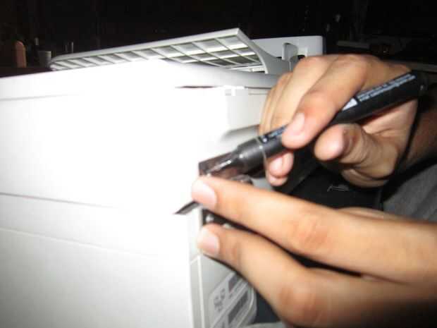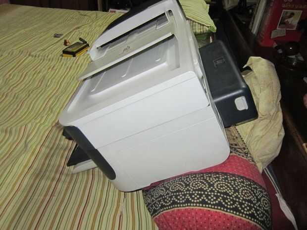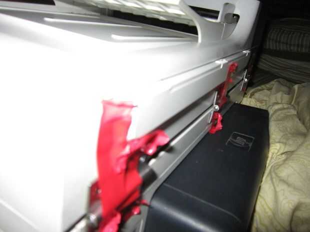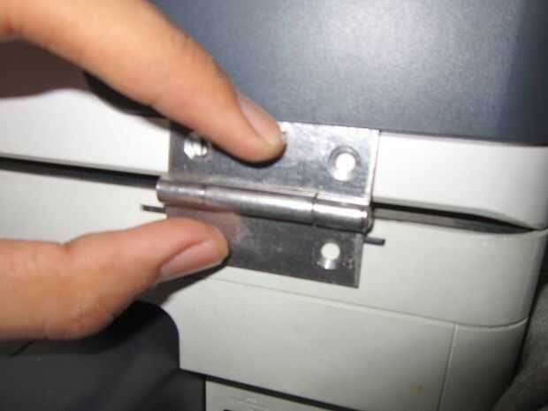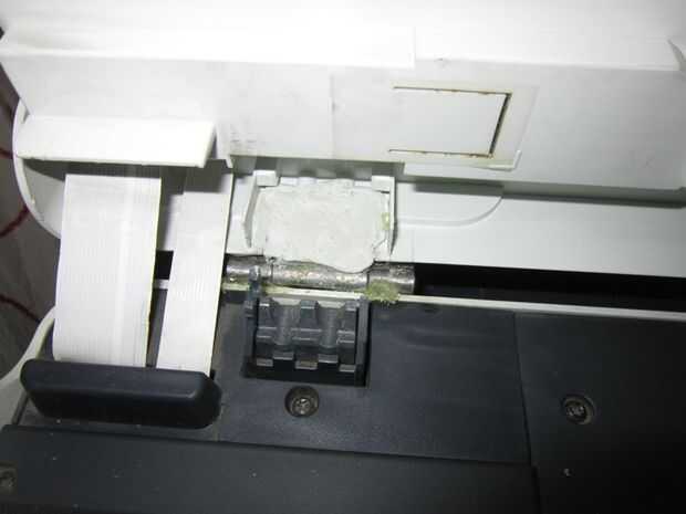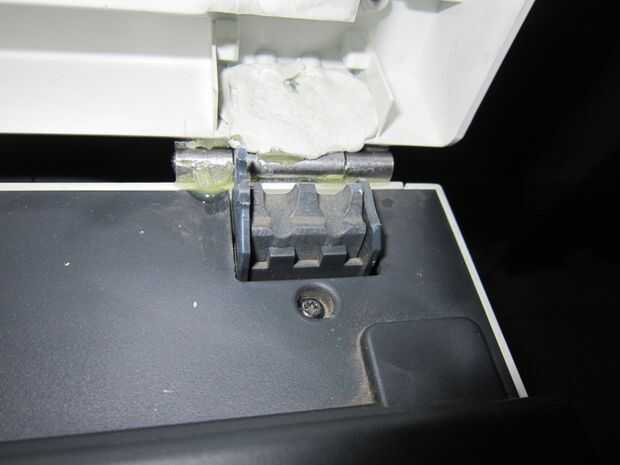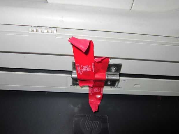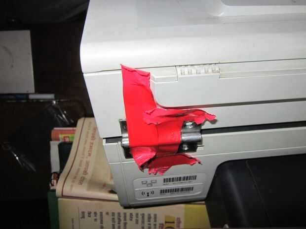 Incline la parte delantera de la impresora hacia abajo, sólo para asegurarse de que las bisagras no cambian de posición mientras el pegamento secando. Poner el pato cintas para doble seguridad. Importante o la puerta no puede abrir correctamente.