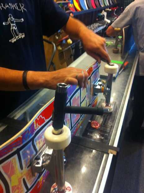 Poner las ruedas en los carros e instalar una tuerca de fijación para cada árbol en el carro.  Obtener una llave de 1/2, estabilizar el patín y atornille las tuercas de camión.
