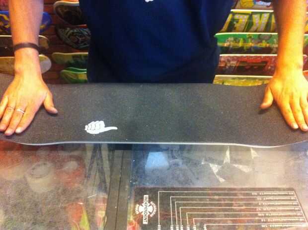 La cinta del apretón en la cubierta del patín, y la cinta de la empuñadura debe estar centrada en la cubierta del patín.  Aplanar la cinta de agarre, asegúrese de que hay no hay aire entre skateboard deck y agarre la cinta.  Su cinta de agarre se debe quedar completamente en la cubierta del patín.