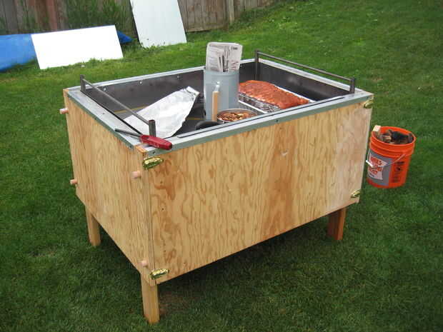 En general, quiere establecer sobre una superficie plana, lejos de cualquier cosa que podría prenderse fuego. Si la bandeja inferior tiene un drenaje, asegúrese de que el desagüe esté cuesta abajo, de lo contrario, usted tendrá un par de galones de grasa de cerdo para ocuparse más tarde. Configurar su pila de leña, para que usted no tiene que alejarse demasiado para conseguirlo.