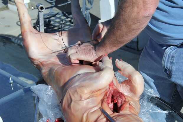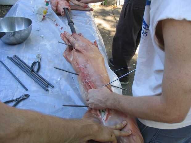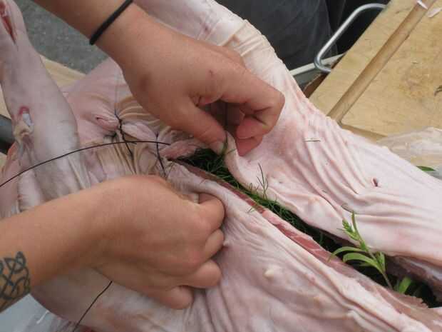 Comience en un extremo y simplemente coser el cerdo cerrado completamente a la otra. Usted puede utilizar una variedad de puntos de sutura para cerrar el cerdo, pero lo que es más fácil para mí es solo para agarrar las dos posteriores de la piel, sosténgalos juntos como una costura de tela y coser utilizando puntos bucles grandes.