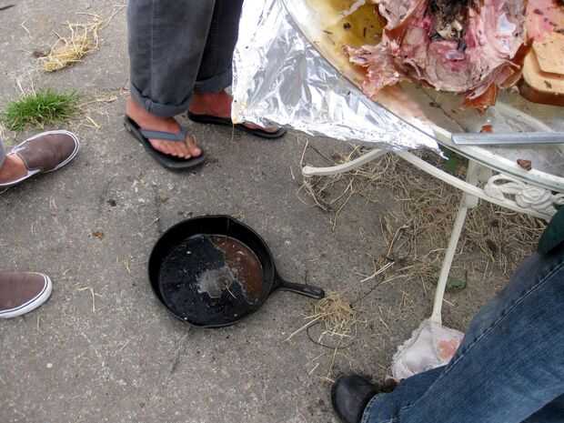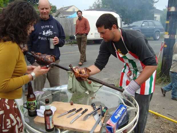 Quitar el espetón del fuego y colóquelo en la superficie de trabajo (lavar todas las superficies de las primeras). Utilice un cortador de alambre para cortar y extraer todo el alambre del achique y piernas y libre del cerdo de la saliva. Retire la varilla deslizando fuera del cerdo.