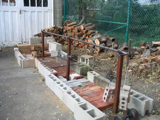 - soportes para el asador - esto puede ser soportes de bloques de cemento, acero con cunas o pipa soldada con autógena en la parte superior, caballetes, rocas, paisajes, otras estructuras y así sucesivamente - solo preferiblemente nada que arde