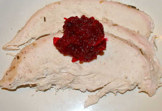 Tallar y servir húmedo y sabroso pavo con salsa gravy o arándano y tubérculos o calabazas.