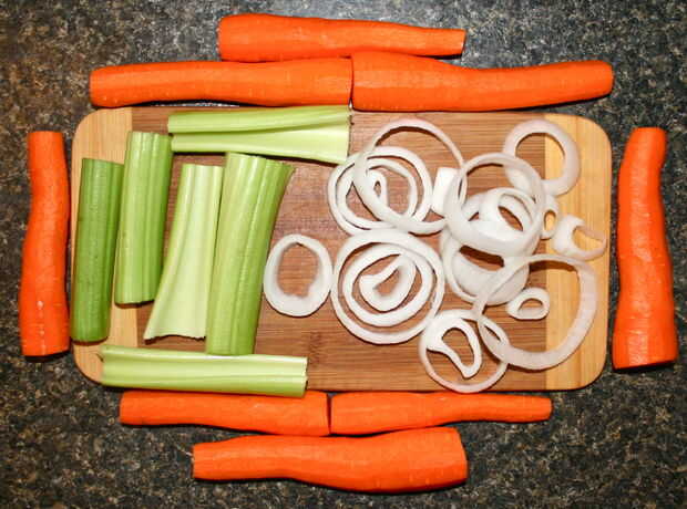 6-8 zanahorias, un par de palitos de apio y la mitad de una cebolla blanca pequeña cortada.