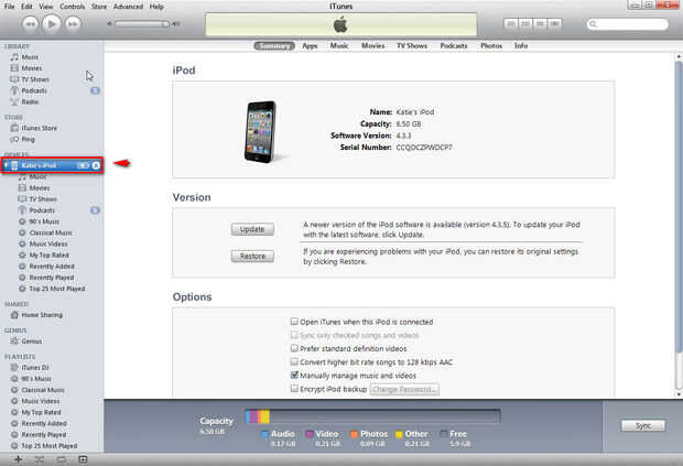 En el panel del lado derecho cuando en la ventana principal de iTunes, haga clic en el dispositivo.