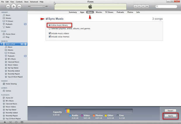 Ahora vamos a la pestaña Música y asegúrese de que usted marque los campos de la "Biblioteca de música entera" y "Sincronizar música".
