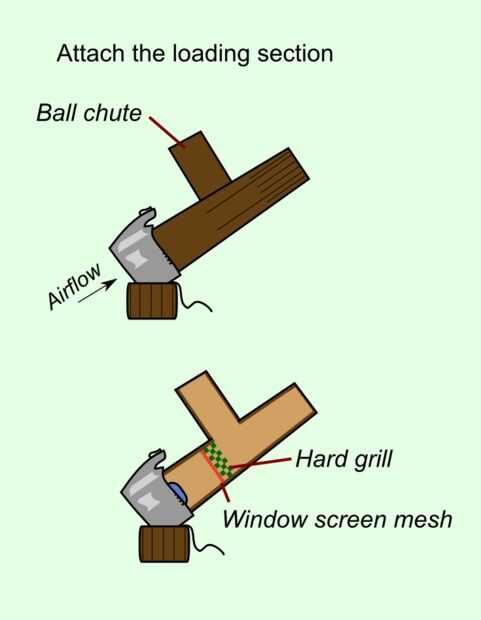 Para guardar pelotas, juguetes y dedos entren en el motor de vacío, inserte una parrilla. Utilicé una rejilla de plástico que es lo suficientemente fuerte como para soportar un martillo, pero también puede hacer su propia parrilla insertando barras a través de la espuma. Desde mis dos años de edad utiliza esto, añadí malla ventana detrás de la parrilla en caso de que algunos juguetes muy pequeños Haz alimentados en él. Siempre probar esta parrilla muy fuertemente antes de continuar construyendo el cañón. Si usted siente que usted podría rasgar hacia fuera con nada menos que su mayor esfuerzo, no es suficiente. Rehacerlo.