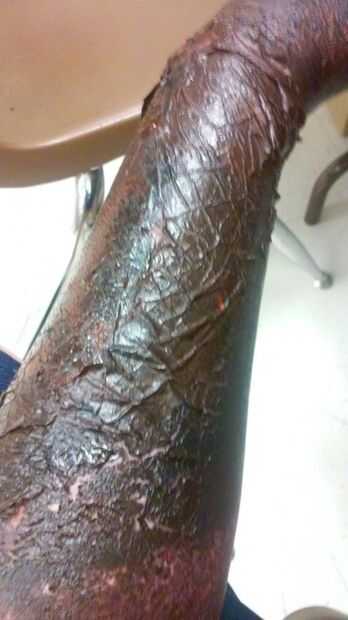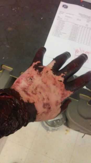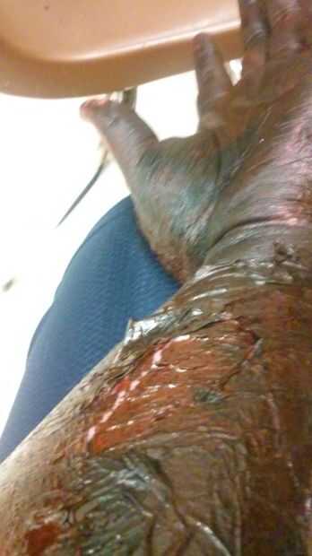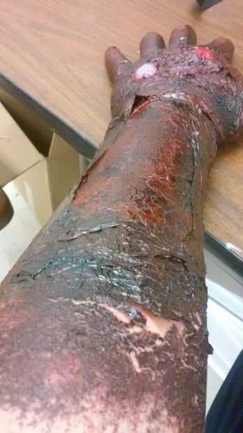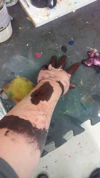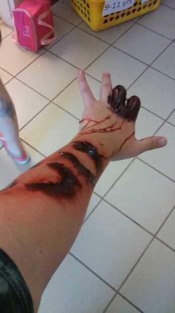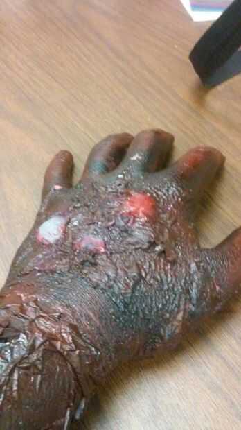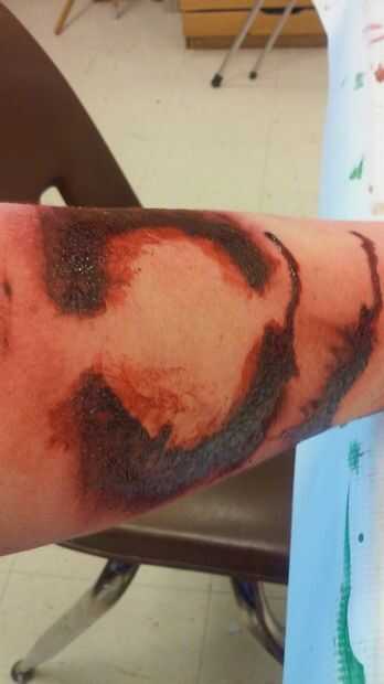 4.) para crear una quemadura como mina uso elmers pegamento, papel de tejido, pintura acrílica (color rojo oscuro, marrón, negro y rojo), falsa sangre, esponja de mar y cepillos. Para realizar ebulliciones utilizan papel higiénico y la vaselina. Para las quemaduras: pegamento en el área deseada quema la pintura, se aplican las capas de papel de seda (hice 3), rip abierto un agujero en el medio los bordes ásperos, pintar pintura acrílica con cepillo de la esponja de mar a partir de rojo, y rojo oscuro y marrón, luego negro en ciertas áreas. En el centro hacer lo mismo pero con solo rojo oscuro rojo y negro. Añadir sangre falsa por todas partes en el medio para crear exudación. Para Forúnculos: Dab glop de vaselina, añadir capa de papel higiénico sobre la parte superior y pintar alrededor de la ebullición. Para crear el área de capa deseado carne carbonizada con pegamento, rip por bolas de algodón, pintura ancianos pegamento sobre las bolas de algodón hasta que la muestra no de algodón, luego pintar de la misma manera que el papel de lazos con más marrón aunque.