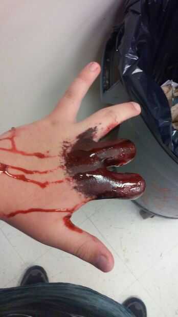 3.) ahora es el momento para crear al zombie. Uso de color marrón claro a hueco las características faciales. Aplicar alrededor de las mejillas delineando los huesos de la mejilla, debajo de los ojos y en las depresiones hacia la parte superior de la cabeza. Esto creará un efecto esquelético, hundido en la cara. Añadir los cortes en la cara con una base de pintura de la cara rojo oscura y sangre falsa. Para crear marcas de la mordedura, aplicar la pintura de cara roja oscura con un pincel en un patrón en forma de u. Añada una línea negra en el interior de las formas de U. Añadir sangre falsa en forma de u hacia donde la línea negra es y baje el goteo. Hice dedos faltantes mediante la aplicación de pintura en los dedos y mantenerlos doblaron y cubrían de sangre.