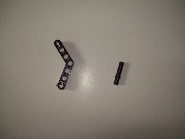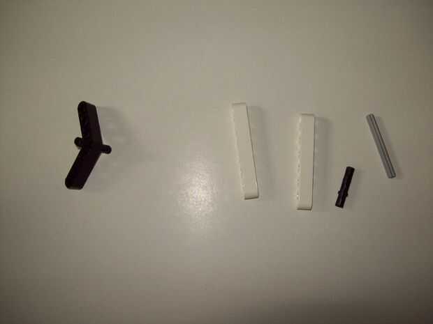 A continuación, poner las piezas blancas de 7-stud a ambos lados del perno negro, con el último agujero de la pieza blanca sobre el eje.